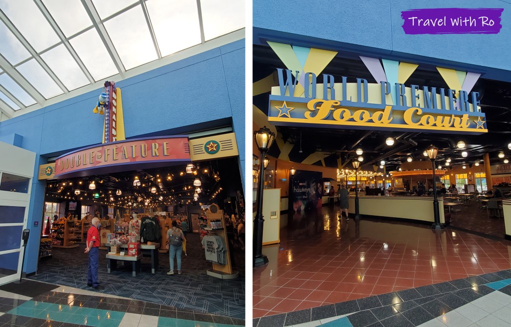 The food court is shiny and movie-themed with plenty of seating. It’s basic counter-service food, so expect fare like burgers, pizzas, and chicken fingers. You’ll also find fun desserts and selections of fruits. Nothing fancy but there’s usually something for everyone.